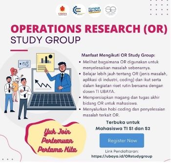 Kegiatan pembelajaran di kampus perlu dilakukan secara menyenangkan dan sesuai dengan bidang minat, namun tetap dengan kualitas pembelajaran dan pencapaian yang baik dan terukur. Untuk mendukung minat belajar bidang Operations Research dan coding, Laboratorium Systems Engineering (SE) Program Studi Teknik Industri (TI) Universitas Surabaya memulai kelompok belajar bersama dengan nama Operations Research (OR) Study Group untuk dosen, mahasiswa, laboran, dan alumni TI Ubaya.