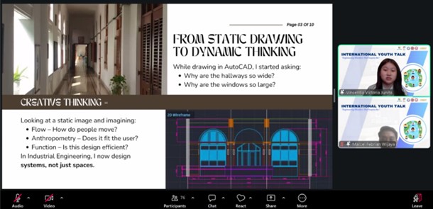 Teknik industri Universitas Surabaya (UBAYA) terus berupaya untuk berkontribusi di skala global. Salah satu upaya yang dilakukan adalah lewat kegiatan sharing oleh mahasiswa Teknik Industri UBAYA dalam International Youth Talk bertema “Engineering Wonders That Inspire Me“. Bersama dengan narasumber lain dari Vietnam dan Indonesia, acara tersebut diadakan oleh PASITA Education pada tanggal 27 Maret 2026 secara daring. Kedua mahasiswa Teknik Industri UBAYA ini, Marcel Febrian Wijaya dan Vincentia Victoria Junita menyampaikan pengetahuan mereka yang telah dipelajari ketika menggunakan software desain AutoCAD dan teknologi machine learning lewat kegiatan belajar mandiri, penelitian dalam tim, dsb.