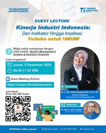 Program Studi Teknik Industri Universitas Surabaya (UBAYA) kembali menunjukkan komitmennya dalam menghadirkan pembelajaran kontekstual melalui penyelenggaraan kuliah tamu daring bertajuk “Kinerja Industri Indonesia: Dari Indikator hingga Implikasi”. Kegiatan yang berlangsung pada Jumat, 5 Desember 2025 ini menjadi wadah strategis bagi mahasiswa dan masyarakat umum untuk memahami dinamika industri nasional melalui pendekatan berbasis data dan kebijakan. Kuliah tamu ini menghadirkan Dr. Ir. Siti Afiani Musyarofah, STP, MT, analis kebijakan dari Kementerian Perindustrian Republik Indonesia, sebagai narasumber utama dan dimoderatori oleh Dr. Moch. Arbi Hadiyat. Kegiatan ini diikuti oleh mahasiswa Program Studi Teknik Industri UBAYA yang telah terakreditasi Unggul dan berstandar internasional.